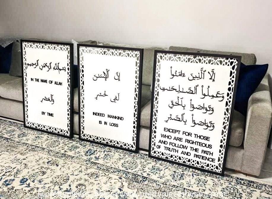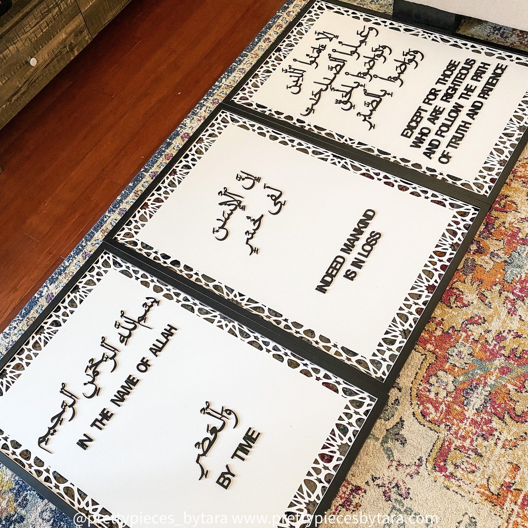 There is a lot of details that go into this stunning set, These frames are filled in with a 3mm thick bamboo backing board with a mosaic border cut out then with 3mm thick acrylic Arabic and English over the top.