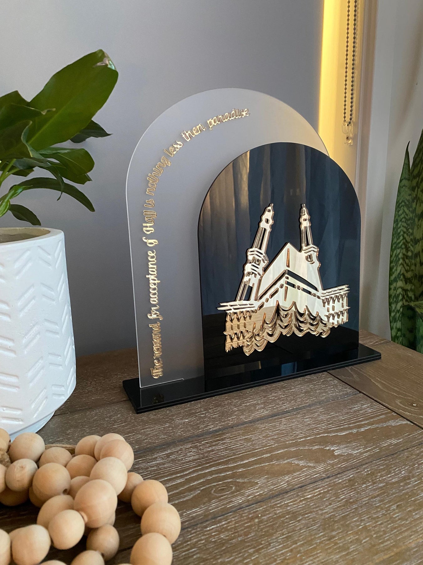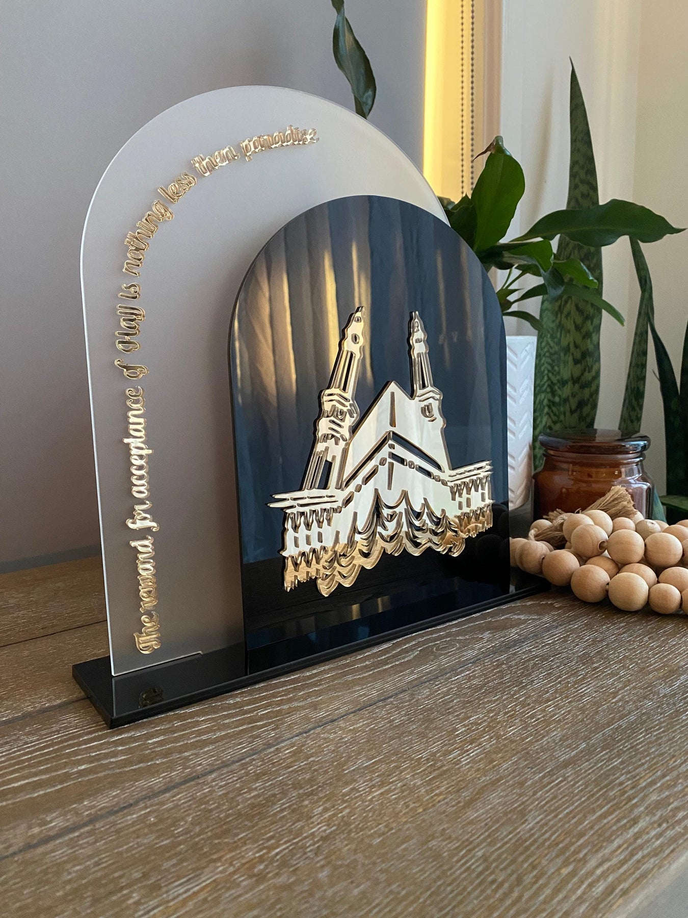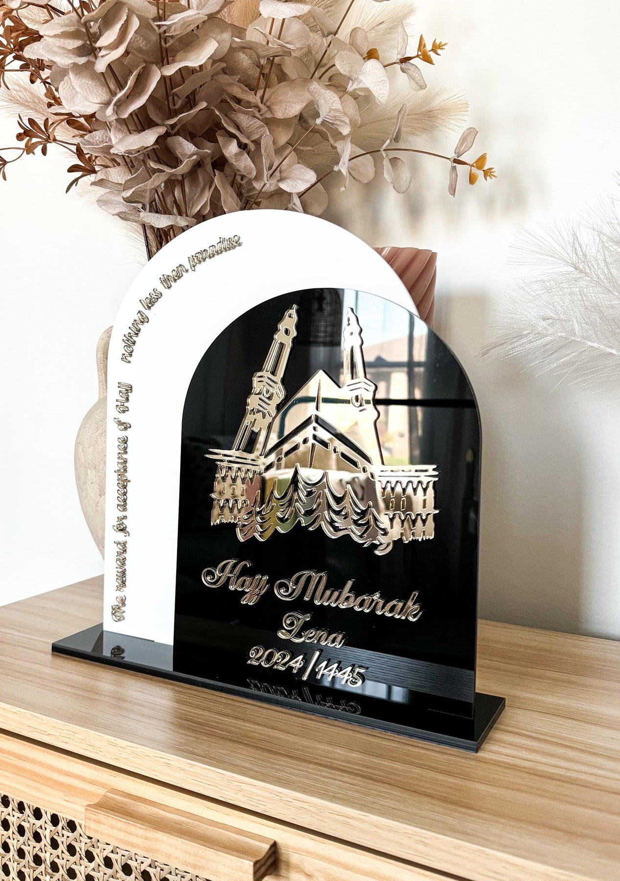 The materials available are colour acrylic for the backing of both arches and the base and either colour or mirror acrylic for the Arabic calligraphy and English text.