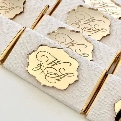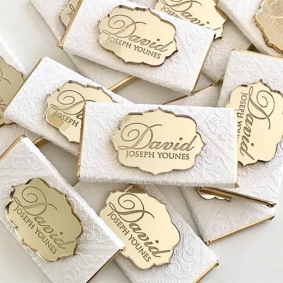 We have our stunning plywood for all rustic events and we have our beautiful mirror acrylic for engraved tags and also our colour acrylic for any laser cut initials or names!