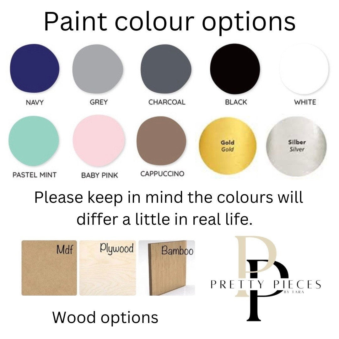these are made from either 6 mm thick MDF wood and painted or 3 mm thick colour or mirror acrylic.