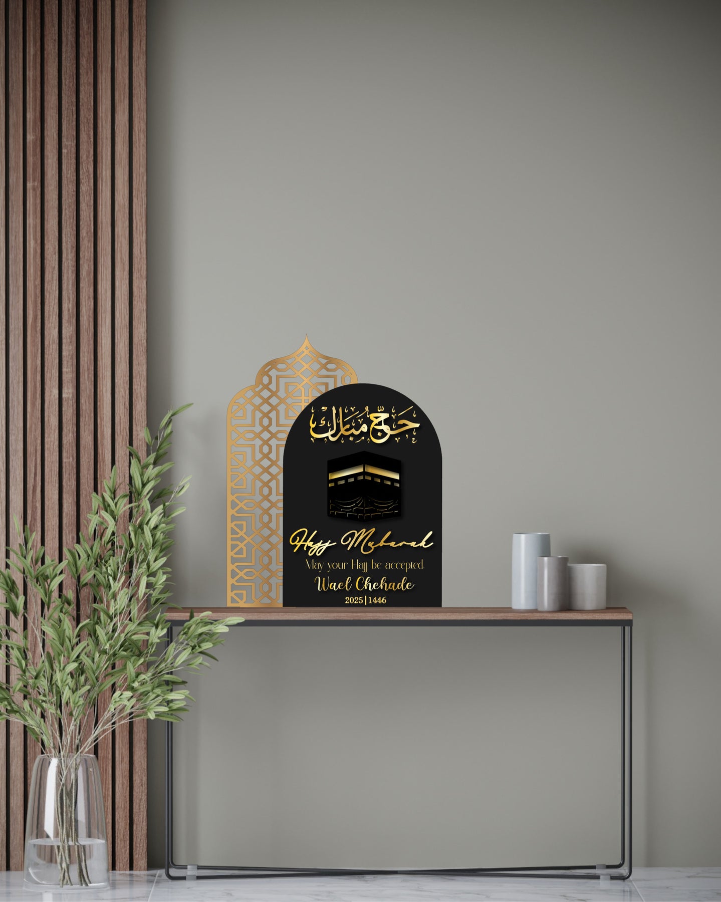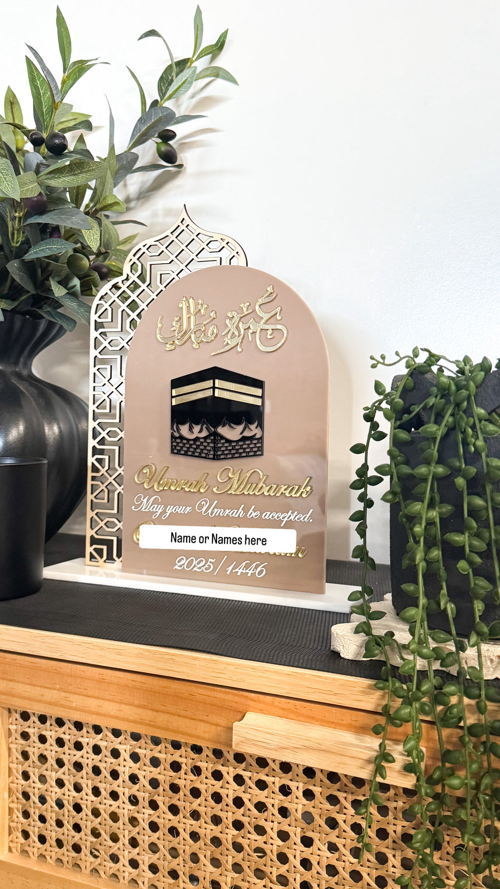 The materials available are colour acrylic for the backing of both arches and the base and either colour or mirror acrylic for the Arabic calligraphy and English text.