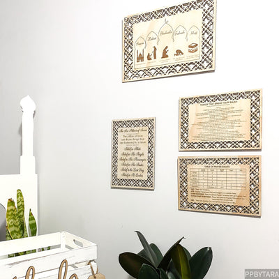 We have introduced some beautiful new designs for your prayer room or prayer soace. These are to help your kids learn the things that break their Salah, the pillars of the Islam and the pillars of Iman and also we have a rakat timetable to help with learning the obligatory salahs and Sunnah salahs.