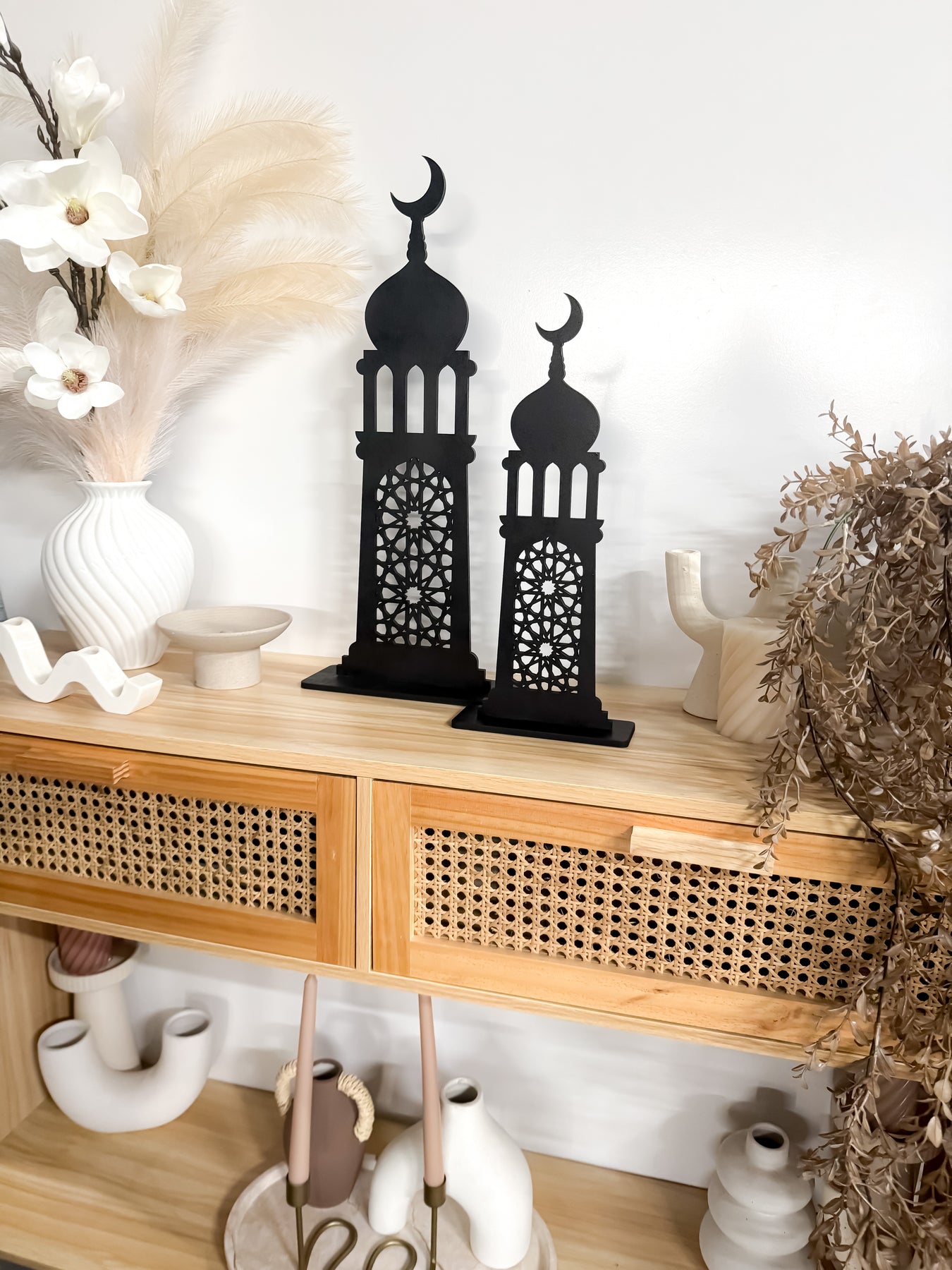 Create a beautiful and serene focal point in your Ramadan corner or prayer room with this handcrafted layered statement piece. Perfect for styling on consoles, buffets, prayer shelves or entryways, it’s a timeless décor item you can cherish and reuse year after year.